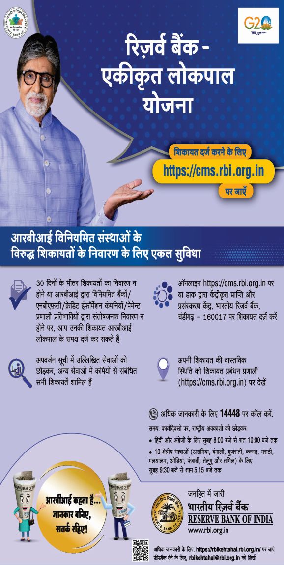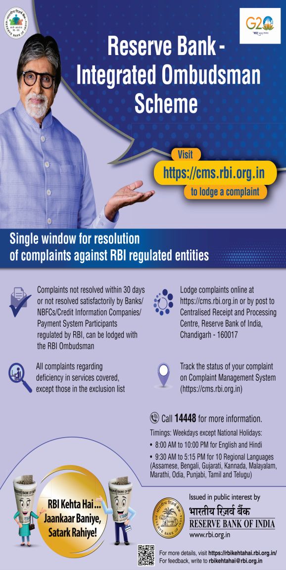 Dear valued customer, our Bank is covered under the Reserve Bank of India- Integrated Ombudsman Scheme, 2021.(Click here for the copy of the Scheme)